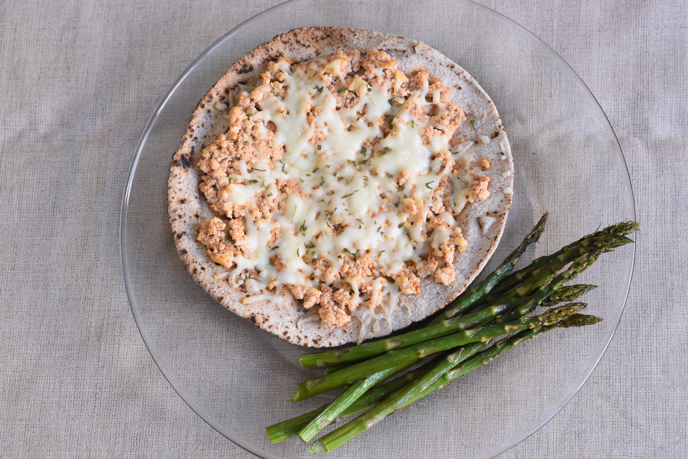 Pizza sur pita au tofu sauce chili, avec asperges grillées